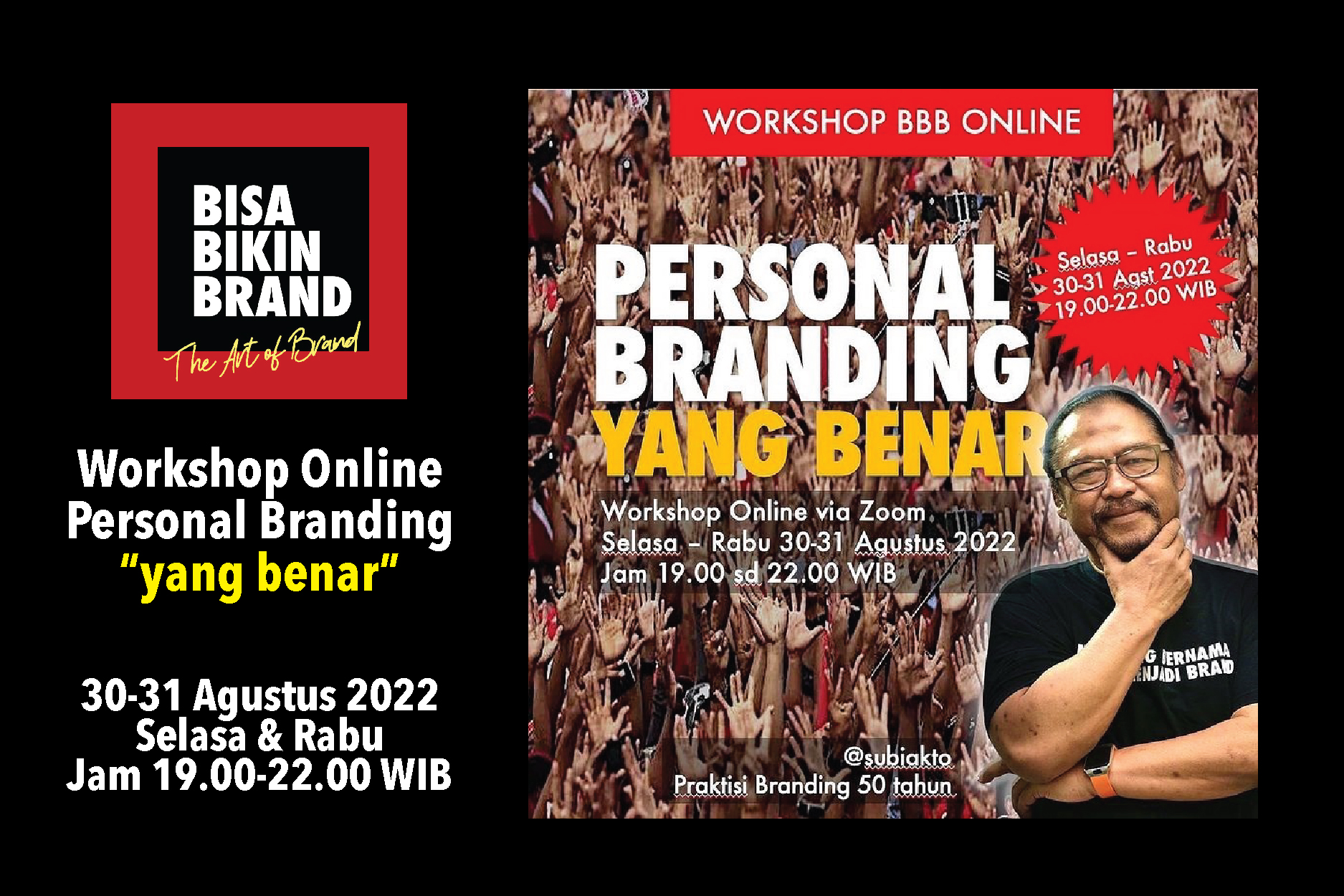 Pak Bi akan menyelenggarakan Workshop Personal Branding “yang benar” 30-31 Agustus 2022 jam 19.00 s/d 22.00 WIB.