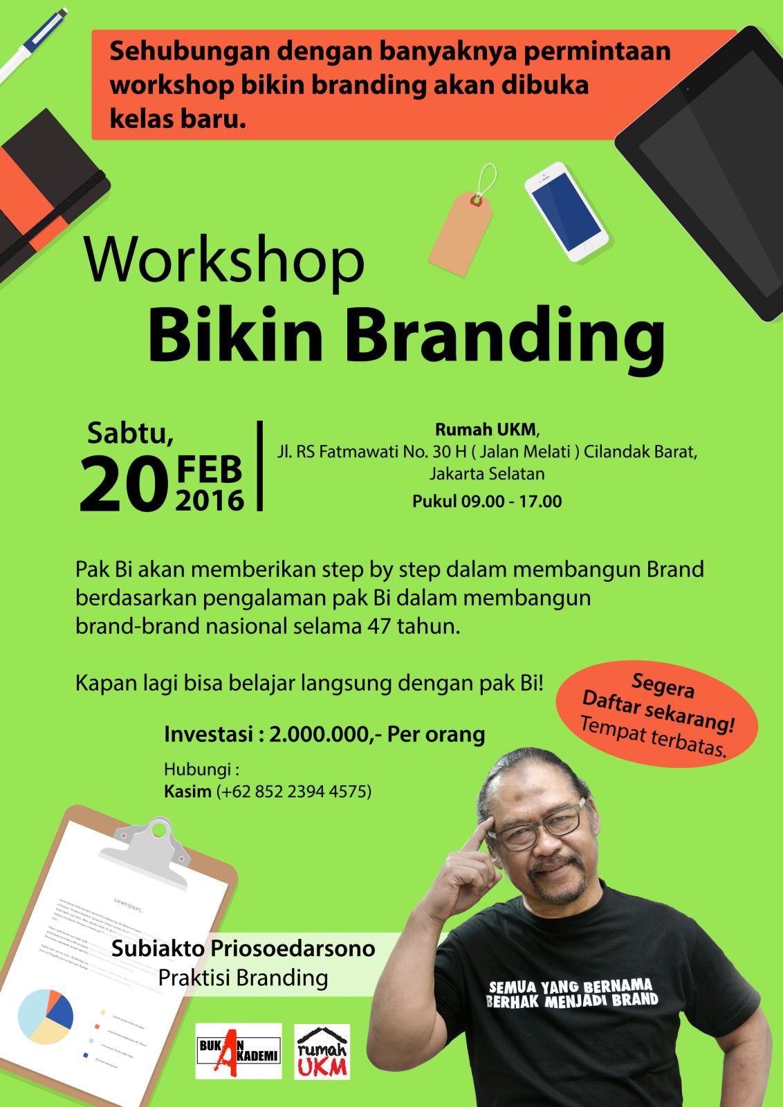 Bikin brand bareng Pak Bi tanggal 20 Februari 2016 dari pukul 9 pagi s/d pukul 5 sore. Syaratnya harus sudah punya bisnis. Hasilnya bisa langsung diimplementasikan.